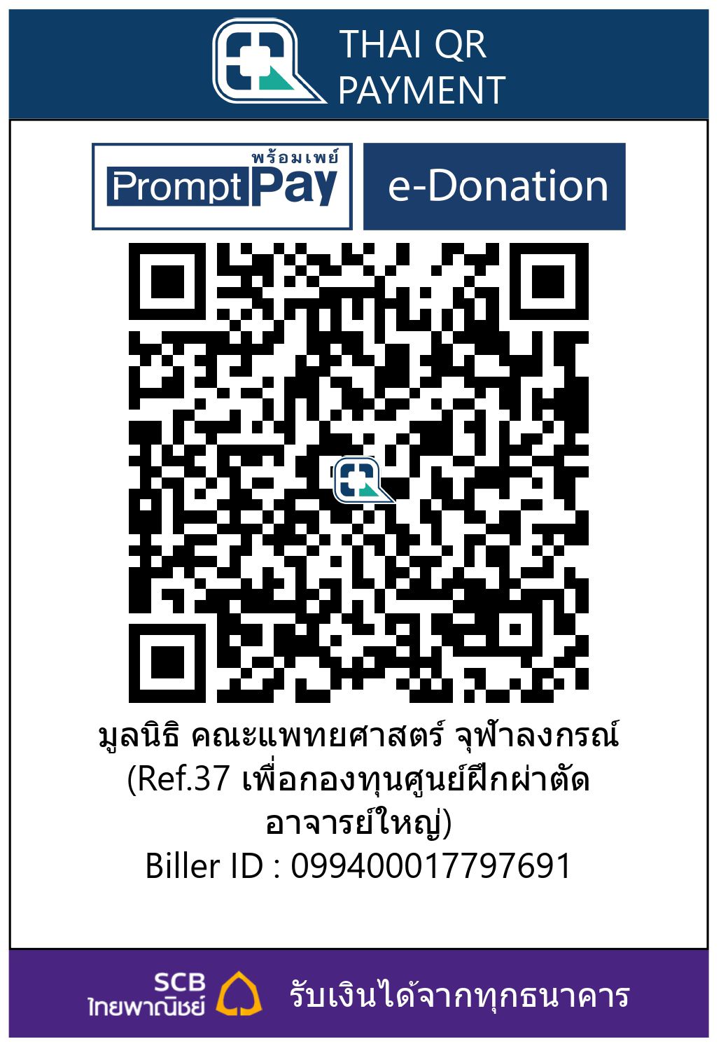 เราขอเชิญชวนท่านร่วมเป็นส่วนหนึ่งในการสนับสนุนการดำเนินงานของ ศูนย์ฯ ผ่าน มูลนิธิคณะแพทยศาสตร์ จุฬาลงกรณ์มหาวิทยาลัย การ สนับสนุนของท่านจะช่วยพัฒนาสิ่งอำนวยความสะดวก ระบบบริการ และโครงสร้างพื้นฐานต่างๆ ให้สามารถรองรับการฝึกอบรมศัลยแพทย์ อย่างมีคุณภาพ ผ่านช่องทางดังนี้: